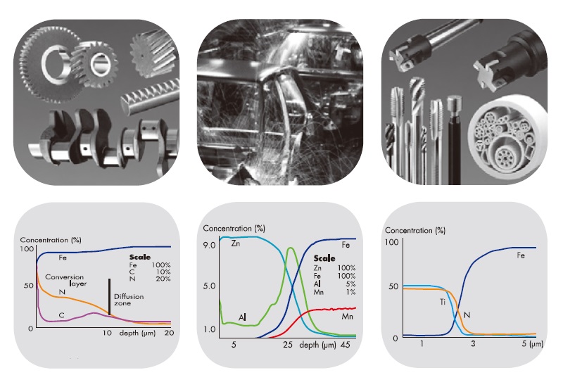 適用于質量控制和材料研究 在金屬分析領域中,輝光放電分析是濃度分析和表面分析理想的手段。 表面處理工藝過程,如表面滲碳硬化或滲碳熱處理等,都可以通過分析被處理材料的表面和近表層區域實現質量控制。 采用濃度分布分析功能可以準確地測量涂(鍍)層厚度及化學成分。 對于傳統的分析方法不能解決的材料分析問題,輝光放電光譜技術可以作為優先選用的方法。