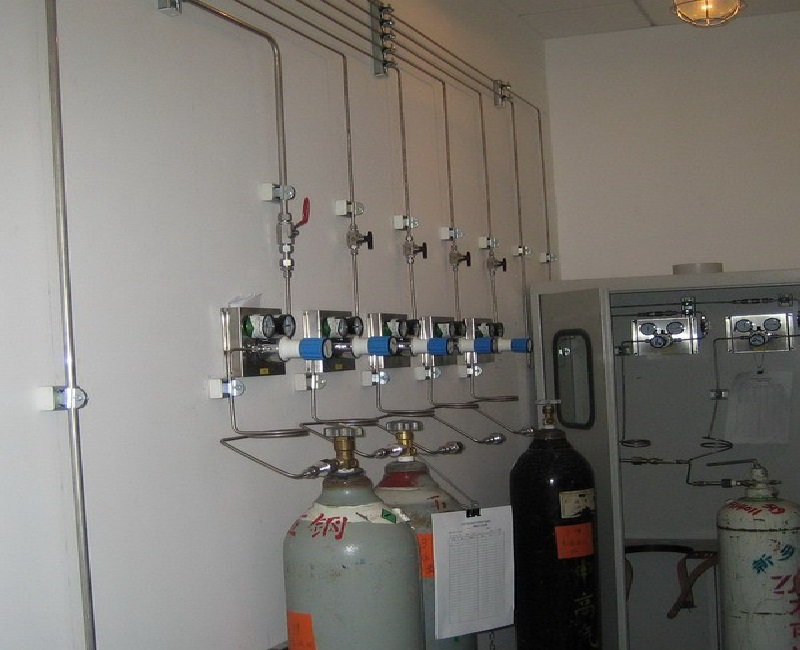 國內實驗室供氣經常使用鋼瓶直供,把氣瓶擺放在儀器旁邊,這樣既不美觀,又有可靠穩患。建議把鋼瓶集中到一個可靠、方便的地方,通過氣路把各種需要的氣體引至各個房間,根據需要在房間安裝開關、調壓閥氣體流量計等,實現遠距離供氣近距離控制,可靠、美觀、節約空間。